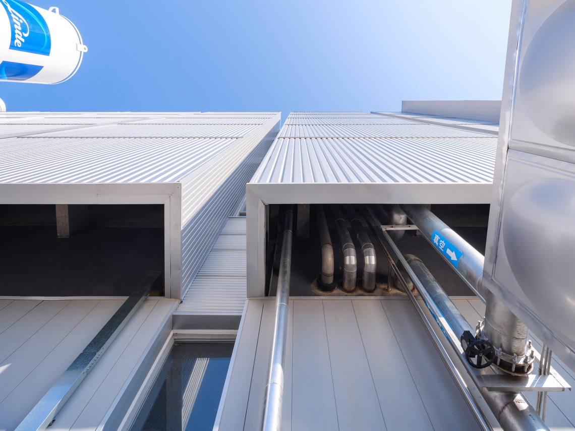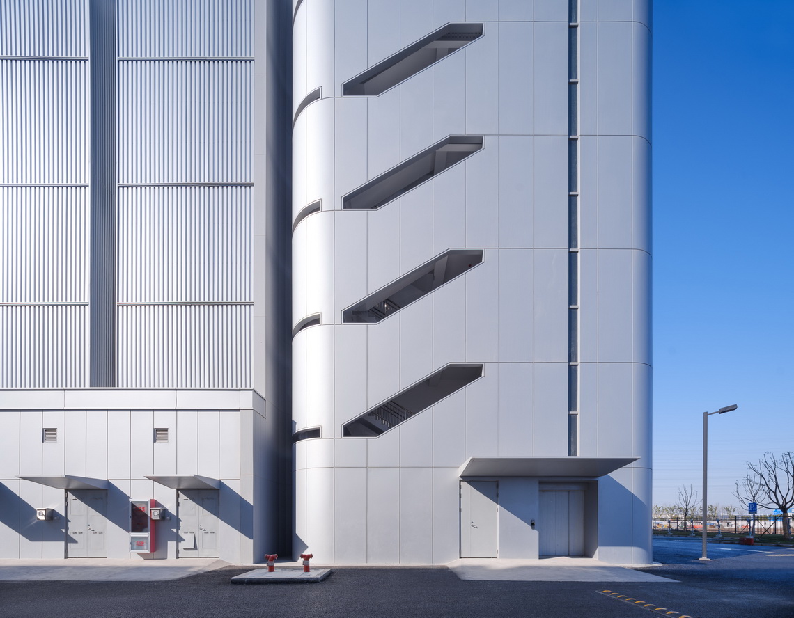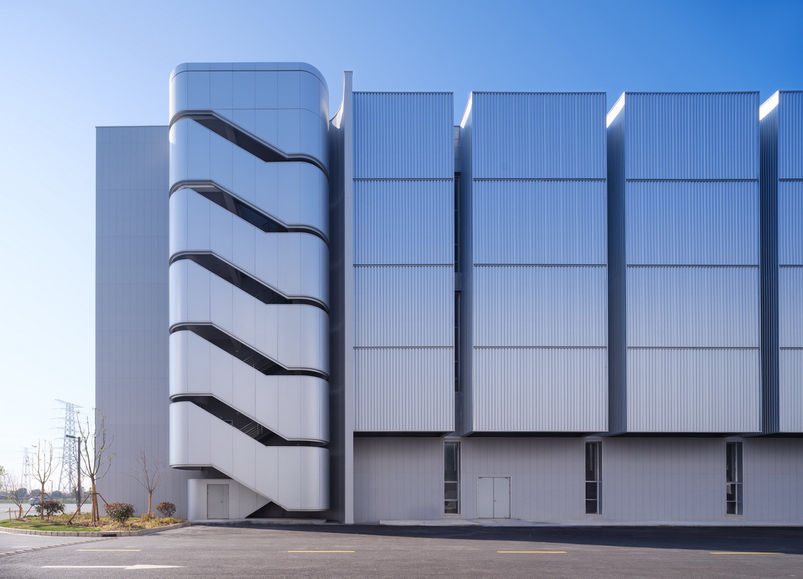 Building facades should be a true reflection of space, structure and function. The design presents functional elements such as process pipelines, traffic spaces, fire rescue windows, and office spaces in different strategies, showing the authenticity and industrial beauty of the building. The selection of color steel plates, stretched aluminum mesh, cement fiber boards and aluminum plates as the main materials not only emphasizes the industrial theme, but also effectively controls the construction cost and efficiency through prefabricated components. Exterior stairs are like sophisticated engine plug-ins. These stairs not only strengthen the vertical transportation function of the building, but also become the visual focus. The office and conference space on the south side uses large-area floor-to-ceiling windows and stretched aluminum mesh to ensure visual transparency and take into account the sunshade effect. The east and west facades are designed alternately with color steel plates and long windows to meet the requirements of equipment technology, ventilation and fire protection regulations of the factory building.