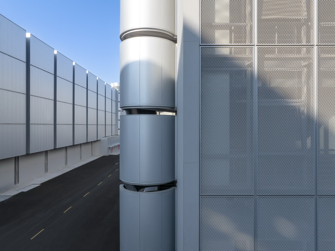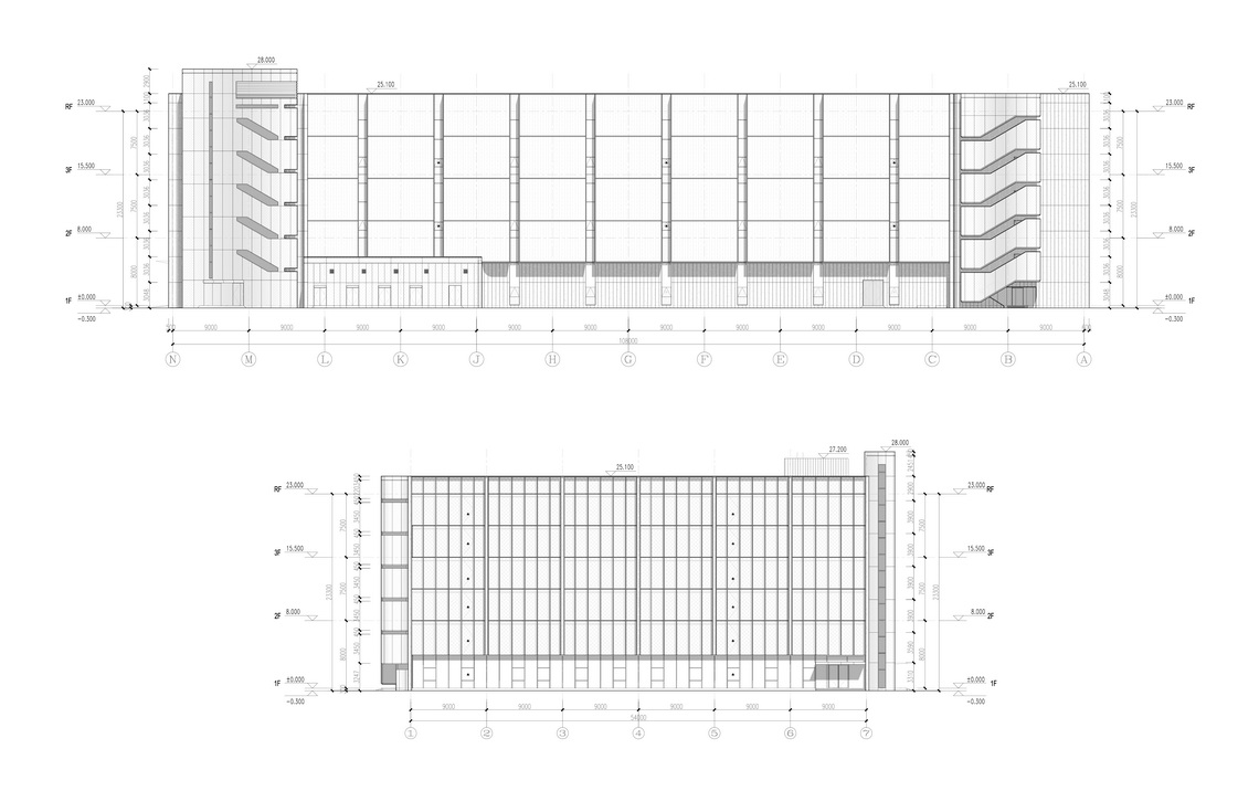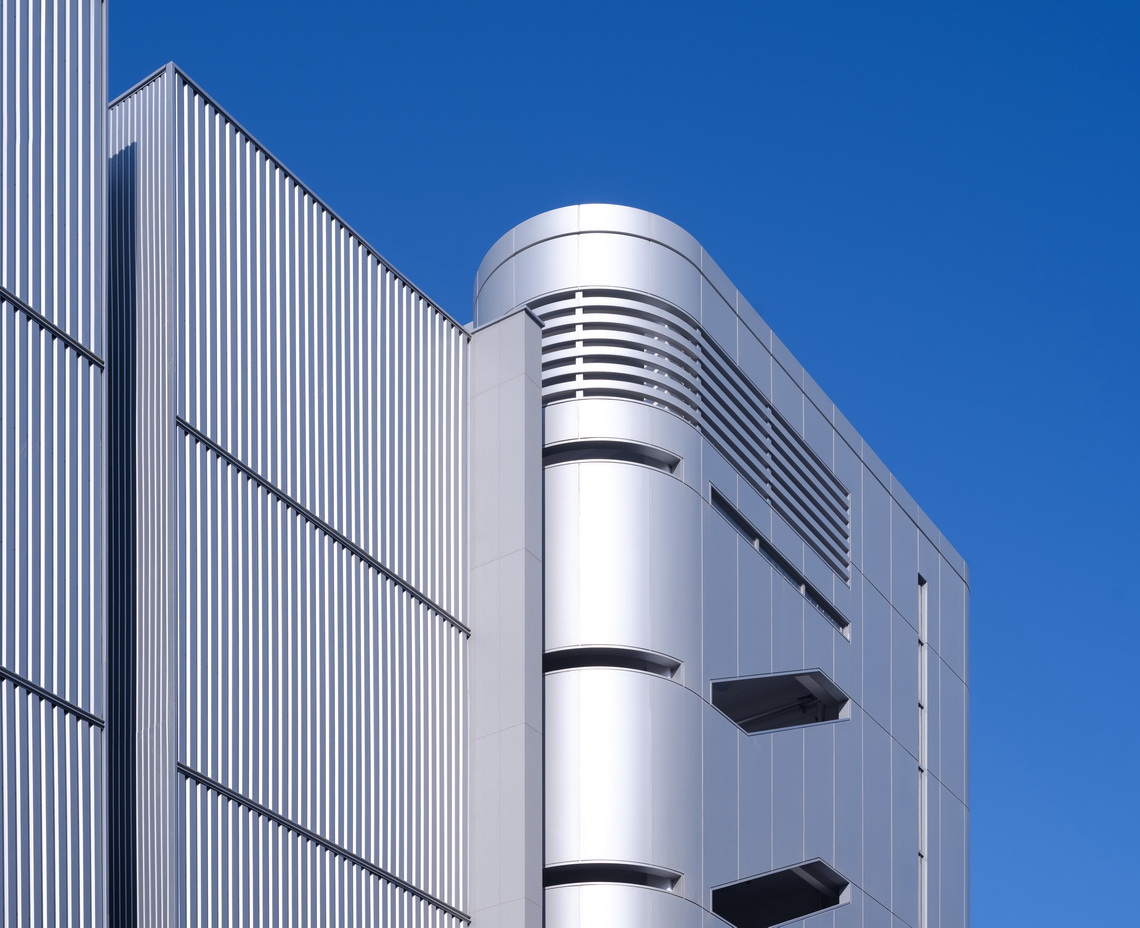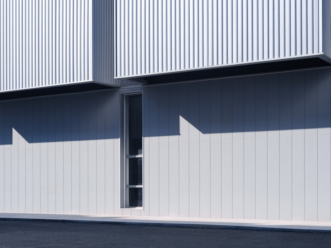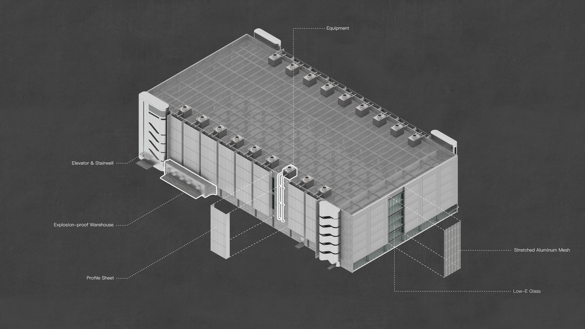 建筑立面应是空间、结构和功能的真实映射。设计将工艺管道、交通空间、消防救援窗、办公空间这些功能要素分别以不同的策略呈现,展示建筑的真实性和工业美。选用彩钢板、拉伸铝网、水泥纤维板及铝板作为主要材料,不仅强调了工业主题,也通过预制装配化的构件,有效控制了建造成本与效率。外置楼梯如同精密的引擎插件,这些楼梯不仅强化了建筑的垂直交通功能,同时也成为视觉焦点。南侧的办公和会议空间采用大面积落地窗与拉伸铝网,确保了视觉的通透性并兼顾遮阳效果。东西立面通过彩钢板与长条窗的交替设计,以满足厂房的设备工艺、通风和消防规范要求。